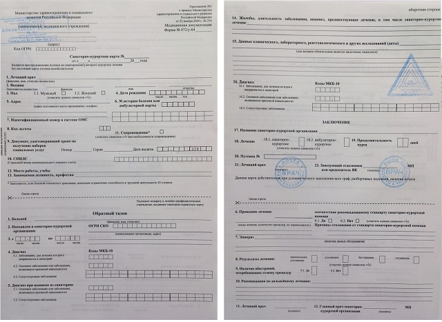 Лечение любого человека в санатории предваряется медицинским обследованием. Его результаты оформляются справкой 072/у, ещё называемой санаторно-курортной картой.